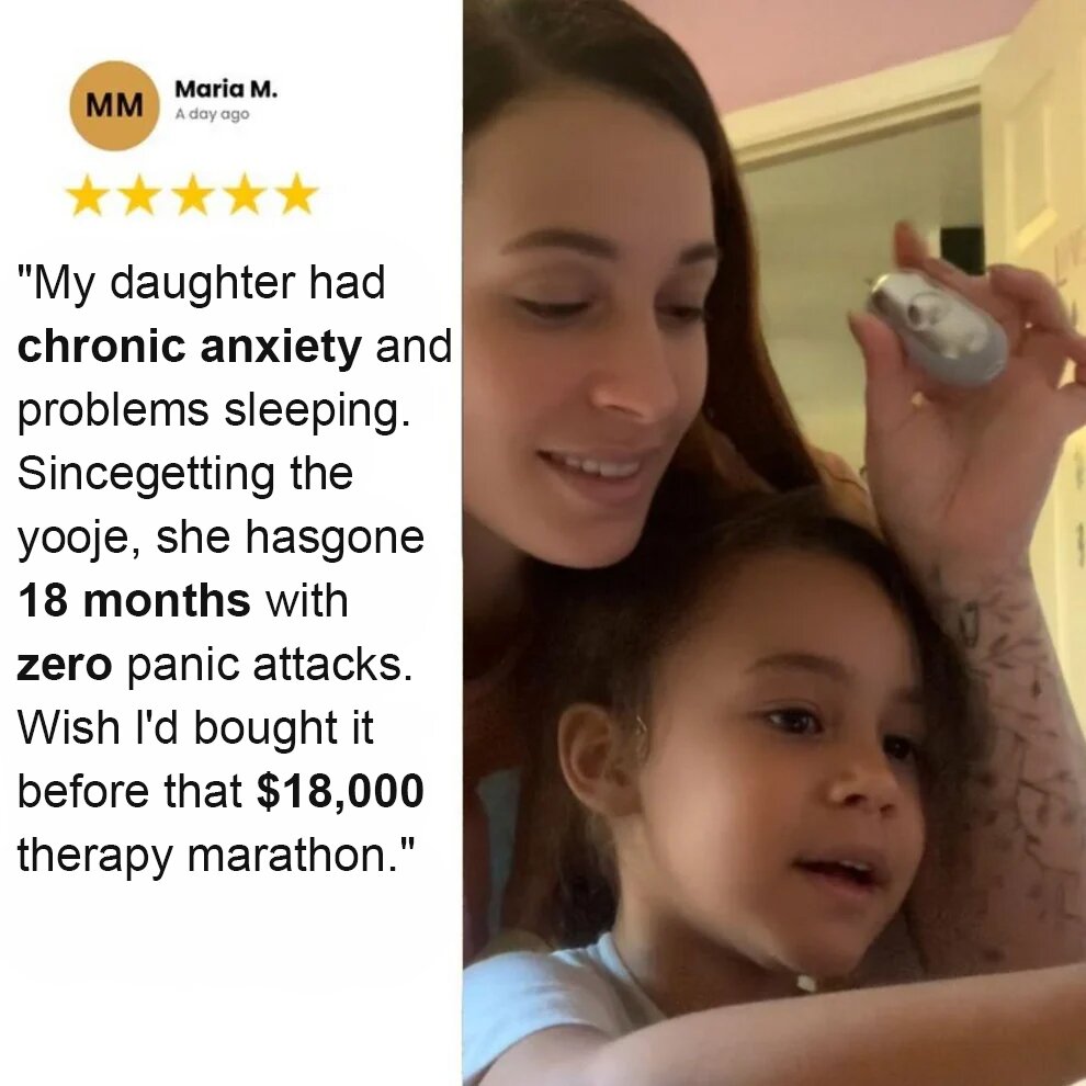 My daughter's chronic anxiety plagued her for the past few years. She suffered weekly panic attacks, often waking up until 3 a.m. with a racing mind. Therapy helped her "understand" her anxiety, but it never stopped her attacks. Out of desperation, I bought the Yooje. Within a few weeks, she was falling asleep in minutes instead of hours. Now 18 months old, she hasn't had a single panic attack. The child who was once drowning is suddenly thriving, improving her grades, developing genuine friendships, and even laughing. This device has given our daughter a new lease on life.