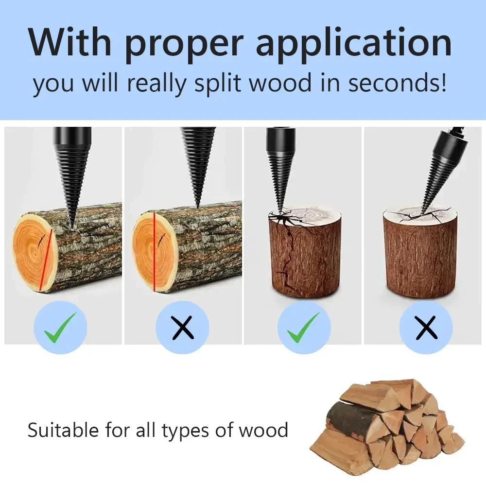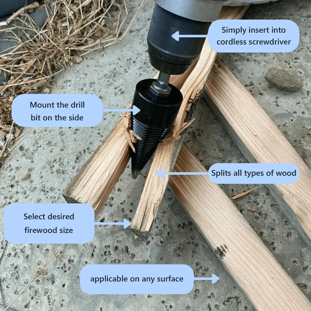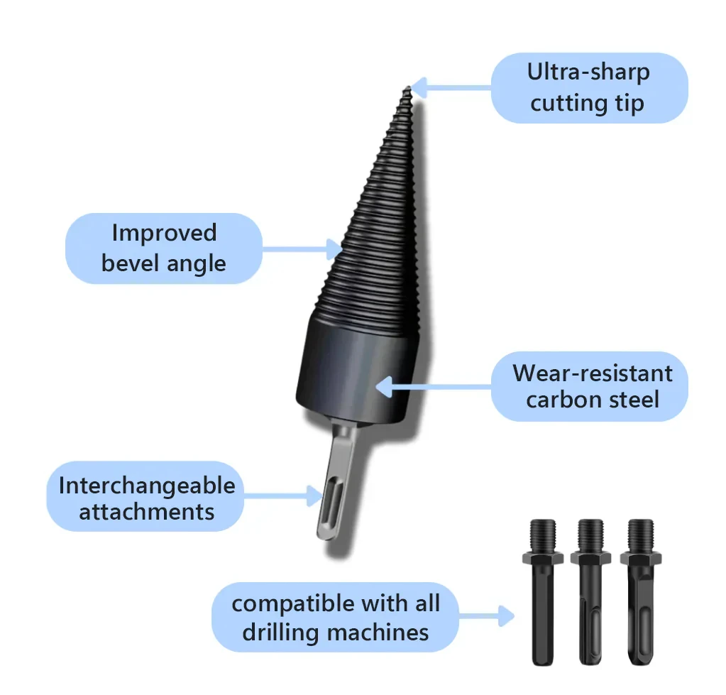 These splitters are heavy duty and VERY sharp. They work with any drill that has a half inch chuck. You must use them correctly or you will find your splitter stuck in the wood. Then you have to break out the channel locks to unscrew it. I learned the hard way! But I like the product and recommend it to anyone who is tired of the hammer and splitter or the axe.